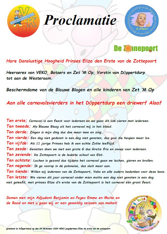De nieuwe jeugdprinses van Döppertdurp is bekend! Prinses Eliza d'n Erste van de Zottepoort (Obs De Zonnepoort) zal dit seizoen samen met adjudant Benjamin, pages Emma en Maite, en de jeugdraad de scepter zwaaien. Ze hebben zin om er een onvergetelijk feestje van te maken.
